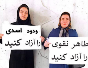 Süheyla Sədəqiani və Zəhra Əsədpur Evin həbsxanasının qarşısında üzərində “Tahir Nəqəini azad edin”, “Vədud Əsədini azad edin” sözləri yazılmış plakatlar qaldıraraq, həyat yoldaşlarının sərbəst buraxılmasını tələb ediblər.